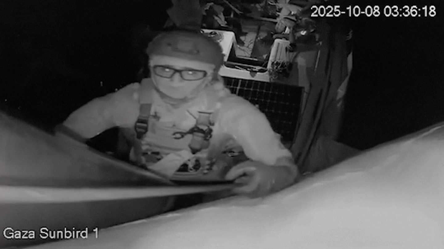 Esta imagem obtida a partir de imagens transmitidas ao vivo do navio Gaza Sunbird, um dos nove barcos que fazem parte da Freedom Flotilla Coalition & Thousand Madleens para Gaza, mostra as forças israelenses se aproximando em barcos, no Mar Mediterrâneo Oriental, na quarta-feira, 8 de outubro de 2025. (Coalizão Flotilha da Liberdade via AP)