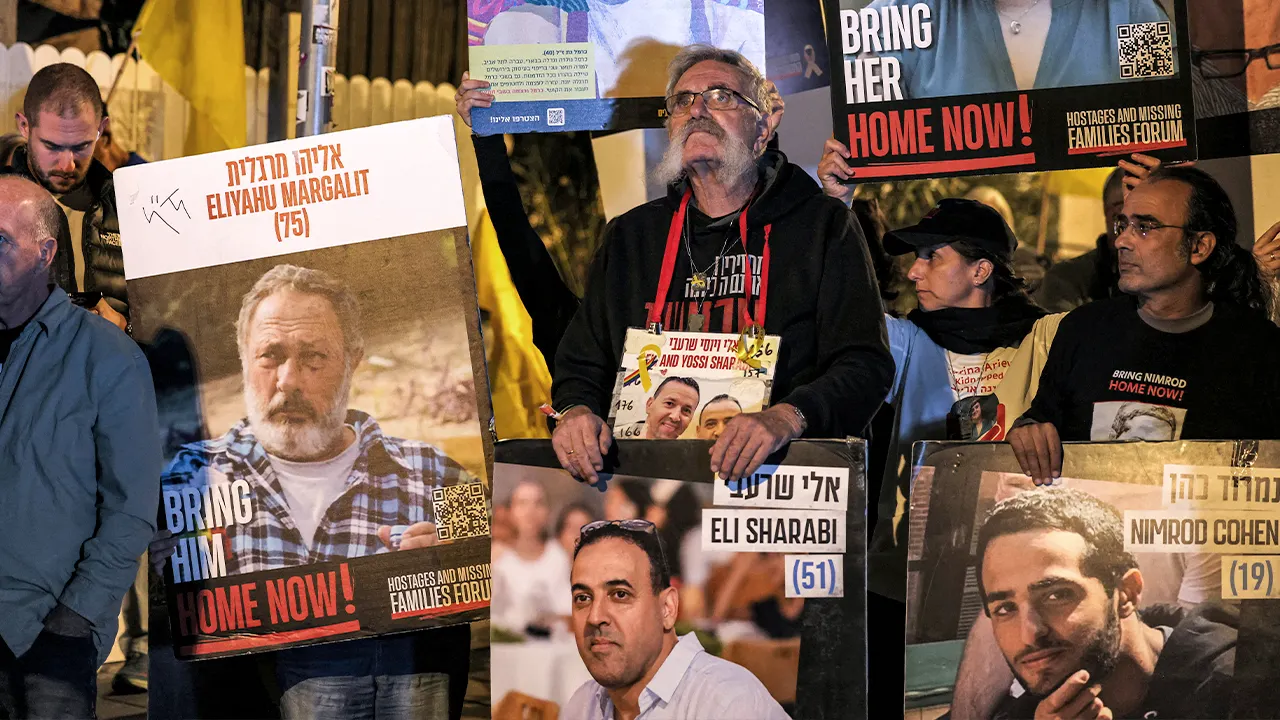 Manifestantes com retratos dos reféns israelenses Eliyahu Margalit, Eli Sharabi, Nimron Cohen e outros durante uma manifestação das famílias dos reféns feitos prisioneiros na Faixa de Gaza por militantes palestinos durante os ataques de 7 de outubro de 2023, em frente à residência do primeiro-ministro israelense na rua Azza (Gaza), no centro de Jerusalém, em 24 de outubro de 2024. (Ahmad Gharabli/AFP via Getty Images)