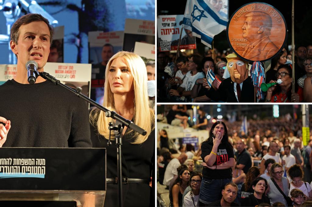 O enviado dos EUA, Steve Witkoff, para o Leste, a primeira filha Ivanka Trump e o seu marido Jared Kushner – que recentemente emergiu como um interveniente-chave nas negociações de paz a longo prazo – dirigiram-se a uma reunião de dezenas de milhares de pessoas que agitavam bandeiras americanas e israelitas e seguravam cartazes com imagens de reféns detidos pelo Hamas.