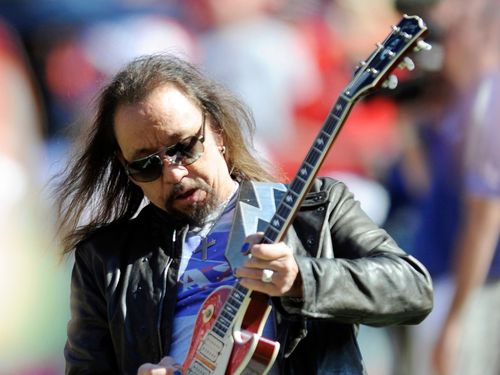 Ace Frehley, à esquerda, da banda de rock KISS morreu aos 74 anos. (AP Photo/Chris Pizzello) (AP)Nesta foto de 2009, o ex-guitarrista do KISS, Ace Frehley, toca o hino nacional antes de um jogo de futebol americano da NFL entre o Kansas City Chiefs e o New York Giants em Kansas City, Missouri.
