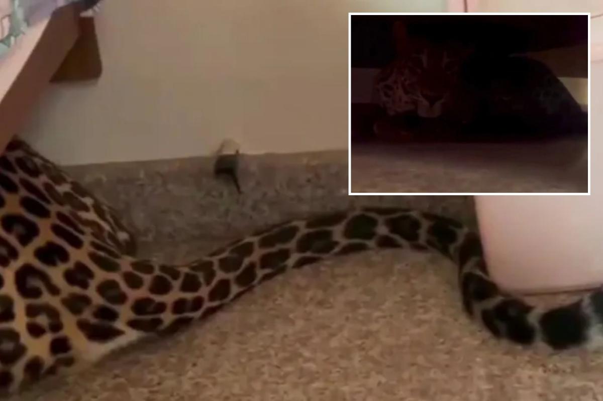 Este é o momento em que uma família descobriu um leopardo escondido debaixo de uma cama depois que o grande felino supostamente apareceu vindo de uma floresta próxima e entrou calmamente pela porta da frente.