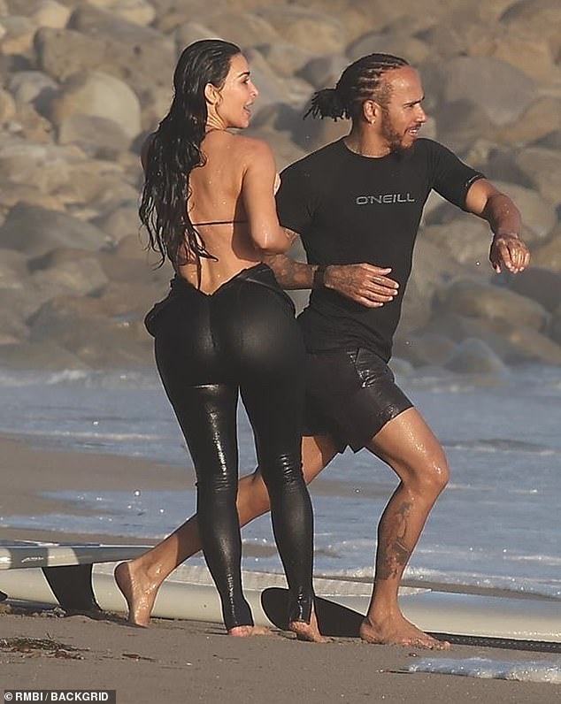 Kim Kardashian e Lewis Hamilton não conseguiam tirar as mãos um do outro enquanto brincavam nas ondas de Malibu na terça-feira.