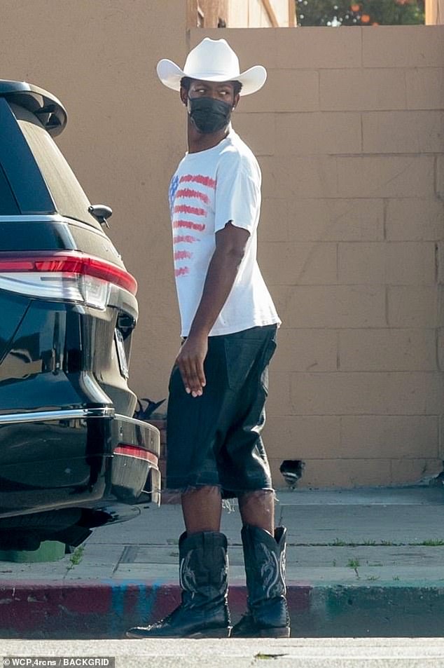 O rapper do STAR WALKIN ‘estava vestido com um chapéu de cowboy Stetson, camiseta com a bandeira americana e botas de cowboy enquanto ajudava a carregar o pesado aparelho em seu SUV