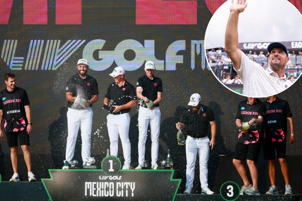 LIV Golf Mexico - Club de Golf Chapultepec, Cidade do México, México - 19 de abril de 2026 Jon Rahm, Tyrrell Hatton, Tom McKibbin e Caleb Surratt da Legion XIII comemoram a vitória na competição por equipes LIV Golf Mexico City