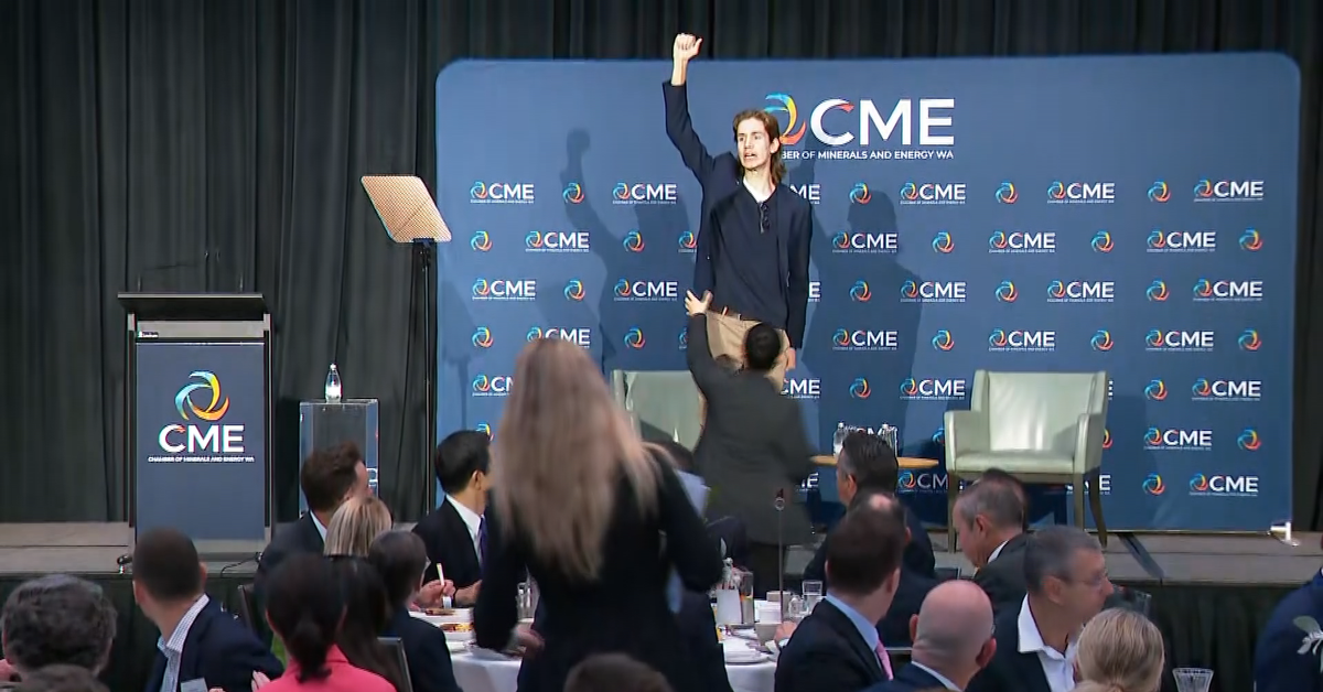 Antes de o primeiro-ministro discursar no café da manhã da Câmara de Minerais e Energia, no Hotel Westin, em Perth, três pessoas subiram ao palco, gritando em voz alta protestos contra uma proposta de expansão para um grande projeto petrolífero no estado.