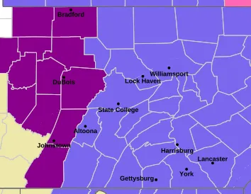 De acordo com o NWS, partes do centro e oeste da Pensilvânia estão sob alerta até as 7h ET de sábado.