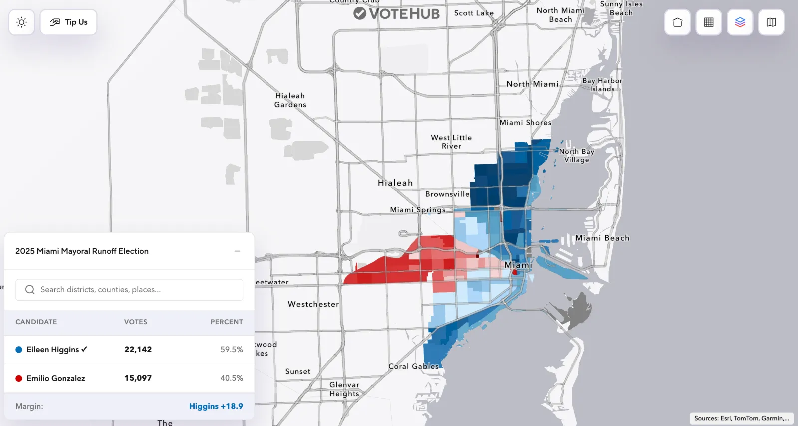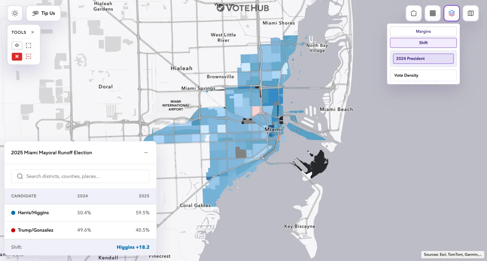 Um mapa criado pelo VoteHub, que mostra os resultados da corrida para prefeito de Miami em contraste com os resultados da corrida presidencial de 2024 na cidade, revela como os eleitores se voltaram para o Partido Democrata neste último segundo turno.