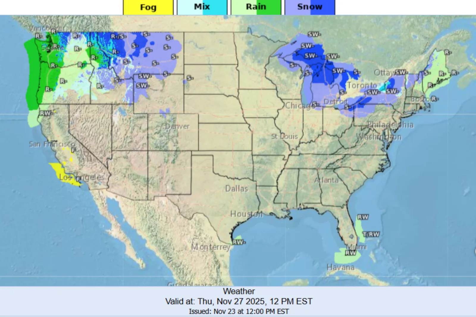 Uma previsão gráfica do Serviço Meteorológico Nacional (NWS) para o Dia de Ação de Graças mostrou que estados incluindo partes de Washington, Idaho, Montana, Michigan, Pensilvânia, Ohio e Nova York poderiam ver neve (a partir das 12h EST).