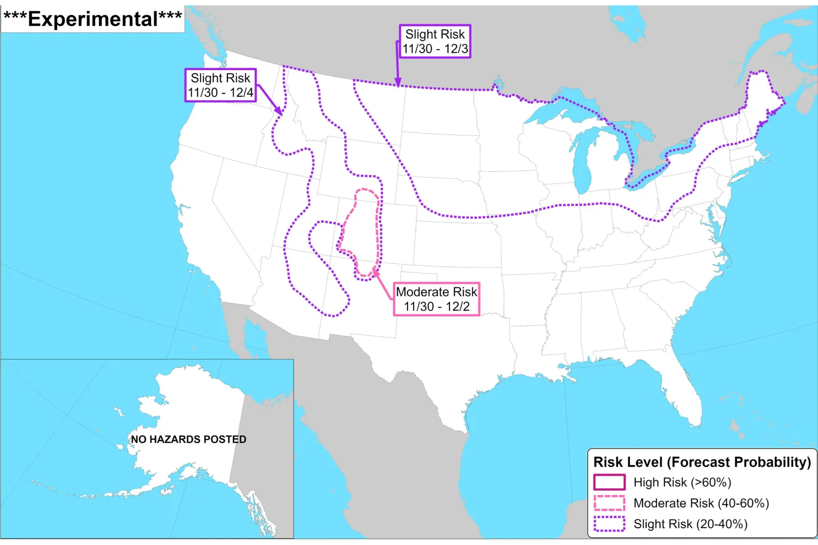 Outra previsão do CPC, desta vez para o período de 30 de Novembro a 6 de Dezembro, mostrou que os estados com maiores probabilidades (40 a 60 por cento) de nevascas fortes incluíam partes do centro e oeste do Colorado, sul do Wyoming e norte do Novo México.