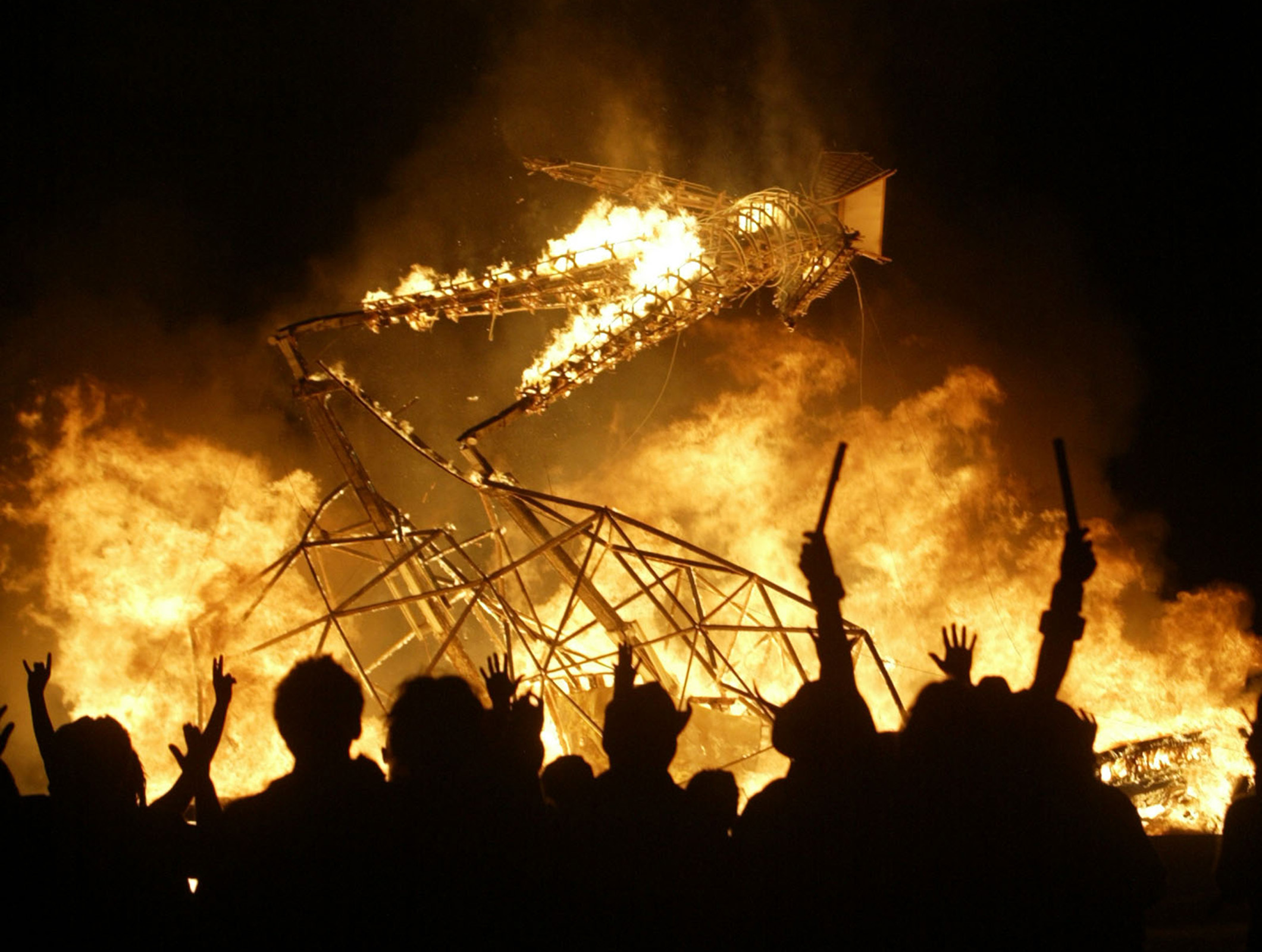 O homem ardente cai no chão no final da celebração em Nevada em 2004.