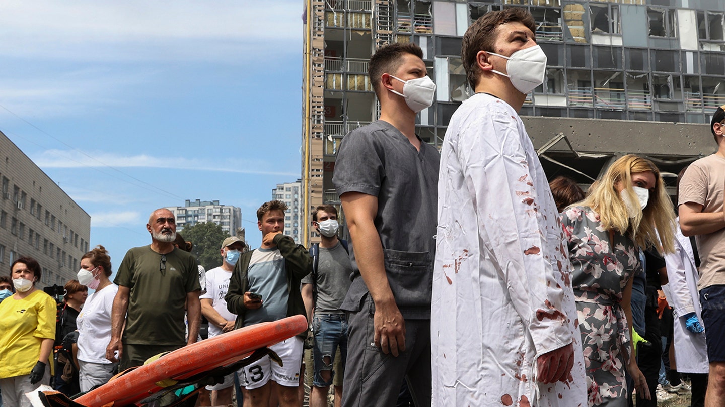 Pessoas e equipes médicas são vistas respondendo ao ataque com mísseis contra um hospital infantil em Kiev. (AP/Anton Shtuka)