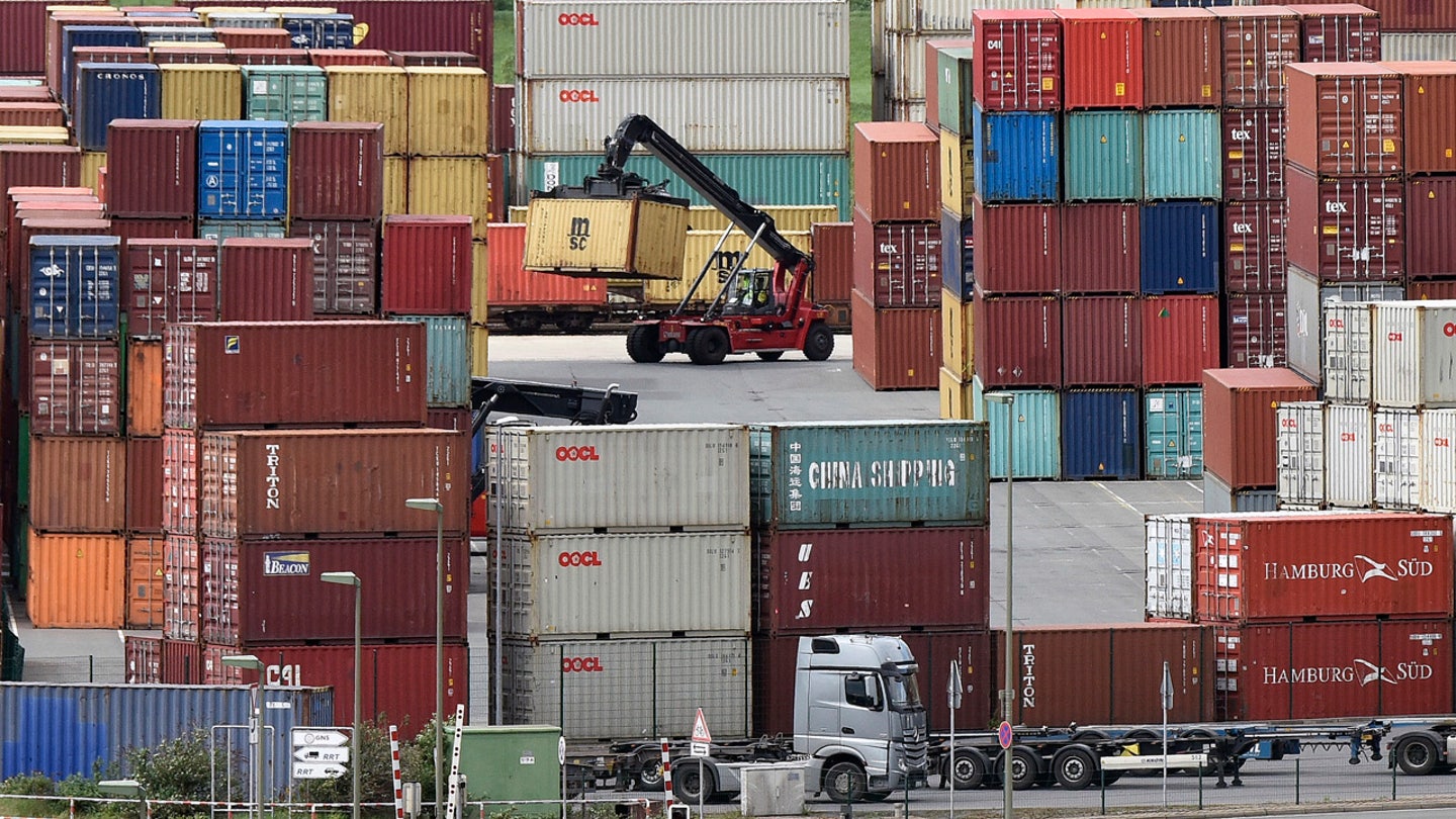 Os contêineres são armazenados para exportações no porto de Duisburg na Alemanha, pois os EUA ameaçam 25% dos carros e até 20% de tarifas em todas as outras importações. (AP Photo/Martin Meissner)