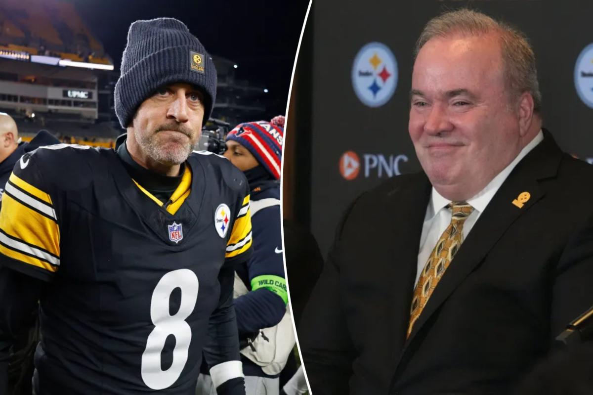 O quarterback do Pittsburgh Steelers, Aaron Rodgers (8), sai de campo no final do segundo tempo, quando o Pittsburgh Steelers enfrentou o Houston Texans na rodada do AFC Wild Card na segunda-feira, 12 de janeiro de 2026, no Acrisure Stadium em Pittsburgh, PA. Robert Sabo para NY Post