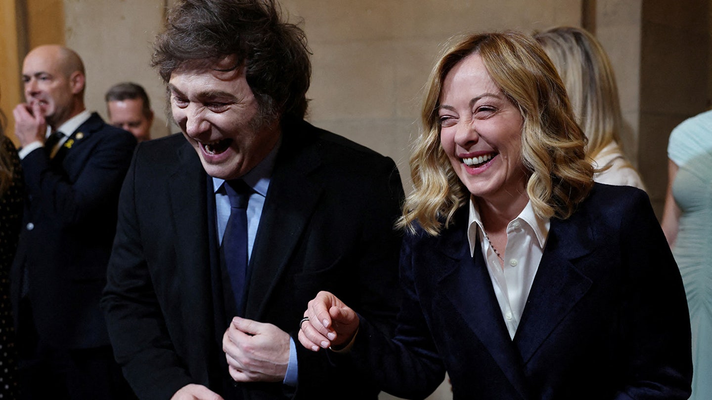 A primeira-ministra italiana, Giorgia Meloni, e o presidente da Argentina, Javier Milei, contam uma piada ao chegarem para a posse presidencial de Donald Trump na Rotunda do Capitólio dos EUA em Washington, DC, em 20 de janeiro de 2025. (Evelyn Hockstein/Reuters)