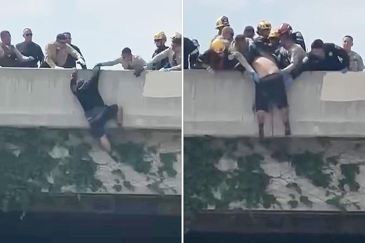 Um homem que tentou pular de um viaduto em uma rodovia em Los Angeles foi salvo na hora certa por um grupo de equipes de resgate em um esforço milagroso que foi capturado em vídeo.