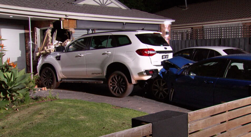 A força do acidente empurrou o veículo da família pela garagem de tijolos. (Nove)