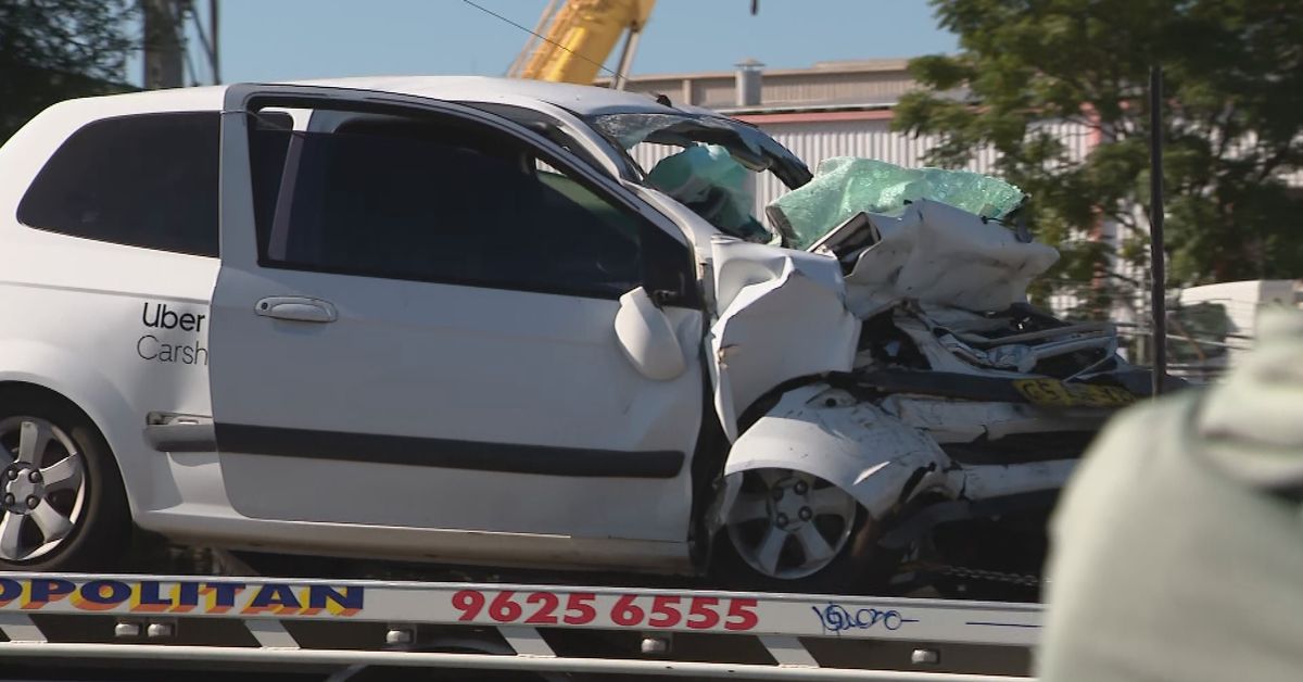 Um Hyundai Getz bateu em um caminhão e trailer estacionado em St Marys em abril de 2024. (Nove)