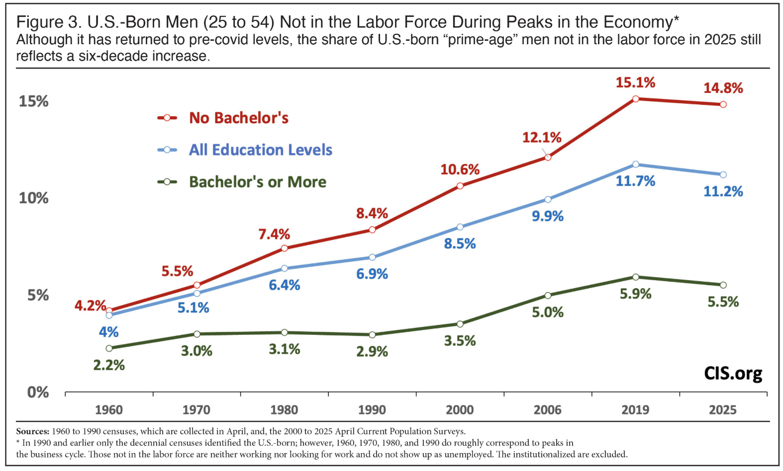 “Se a mesma proporção de homens nascidos nos EUA (16 a 64 anos) estivesse na força de trabalho em 2025 como em 1960, haveria mais 8,9 milhões de homens nascidos nos EUA na força de trabalho”, escrevem Camarota e Zeigler. “Mesmo que a percentagem regressasse apenas ao nível de 2000, ainda assim acrescentaria 4,1 milhões de homens nascidos nos EUA à força de trabalho.”