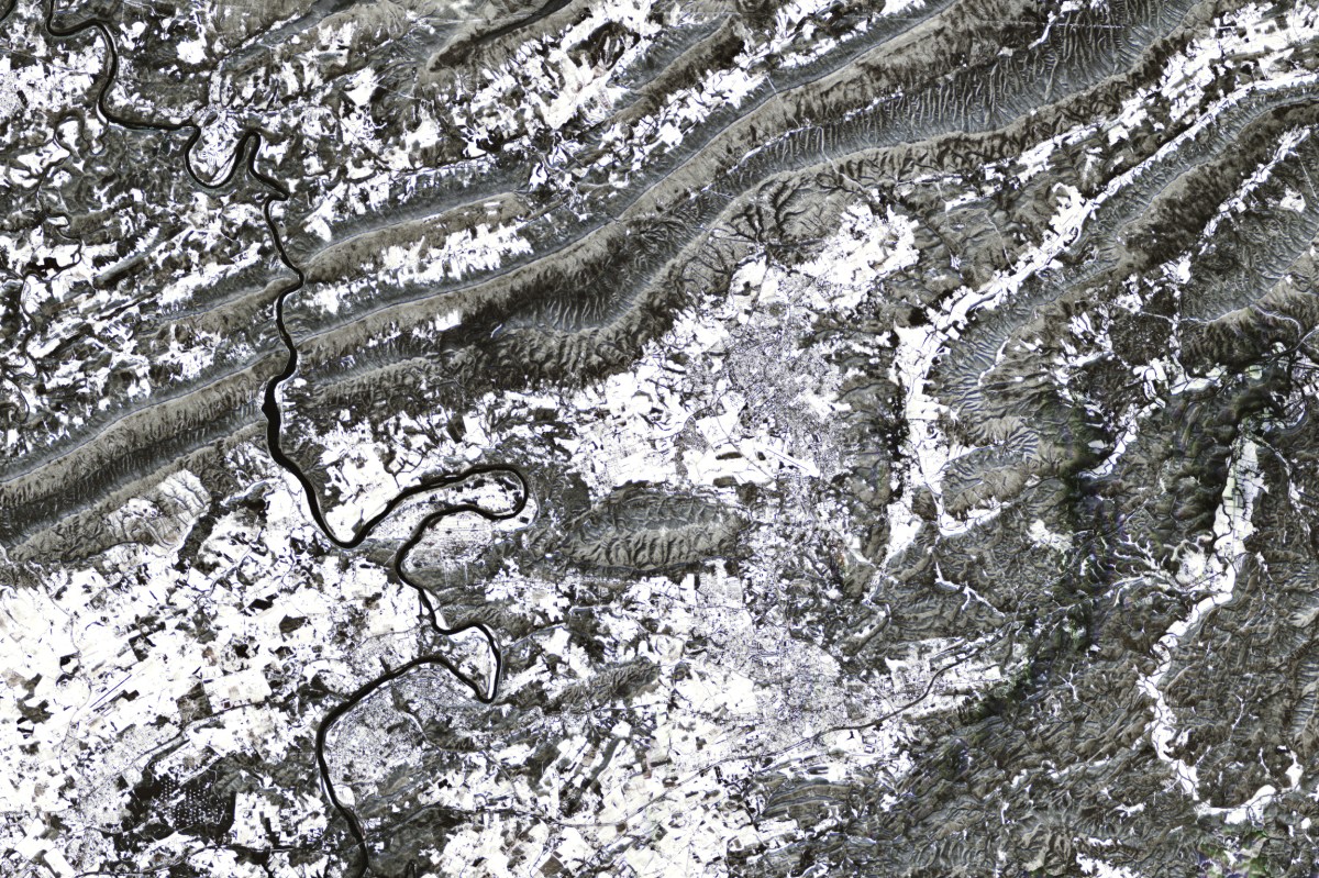 A nordeste de Price Mountain, a paisagem de Blacksburg apresenta um cenário verde e cinza, com Ellet Valley permanecendo verde até o início de dezembro, “muito depois de as cordilheiras circundantes escurecerem, devido aos campos agrícolas irrigados, pastoreio de gado e campos de golfe”, disse a NASA.