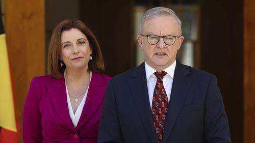 A Ministra das Comunicações, Anika Wells, e o Primeiro Ministro, Anthony Albanese. (Alex Ellinghausen)