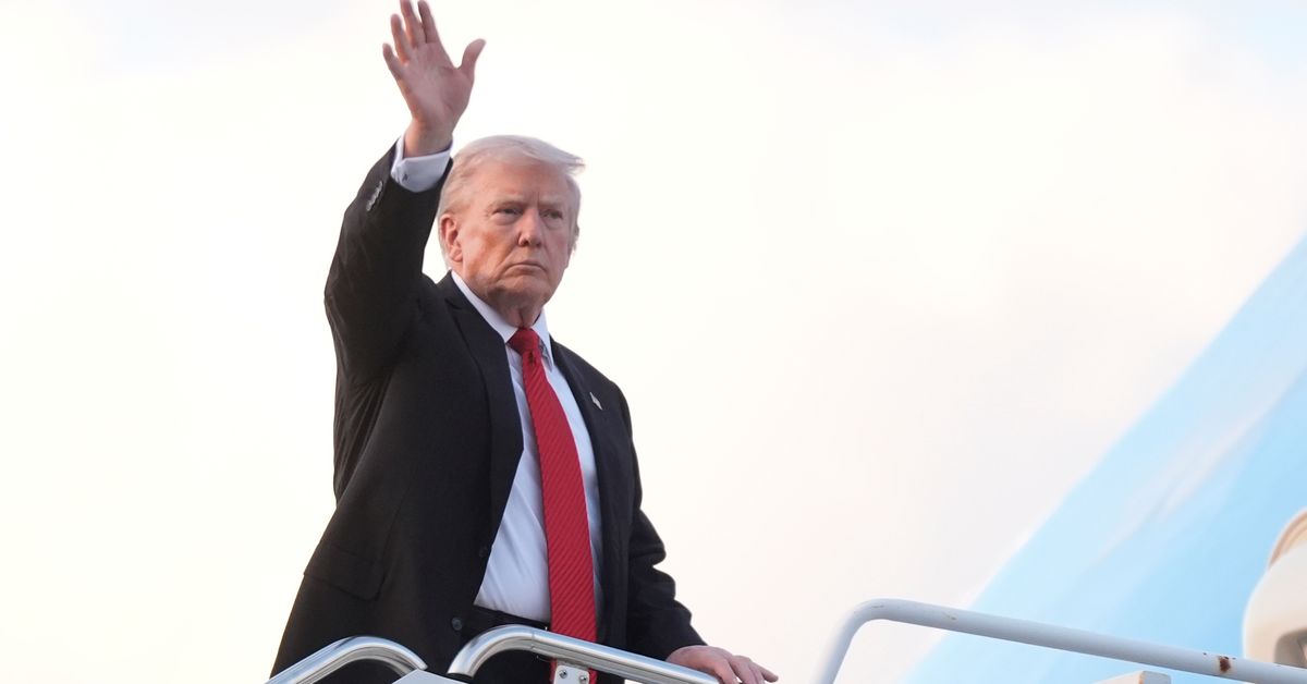 O presidente Donald Trump acena ao embarcar no Air Force One no Aeroporto Internacional de Palm Beach. (AP)