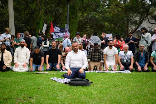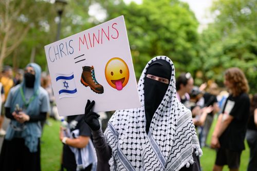 Filas de policiais do lado de fora da Delegacia de Polícia de Surry Hills. Filas de policiais do lado de fora da Delegacia de Polícia de Surry Hills. (Nove)Uma pessoa segura um cartaz que diz “Chris Minns = lambedor de sapatos israelense” durante o protesto no Harmony Park. (Getty)