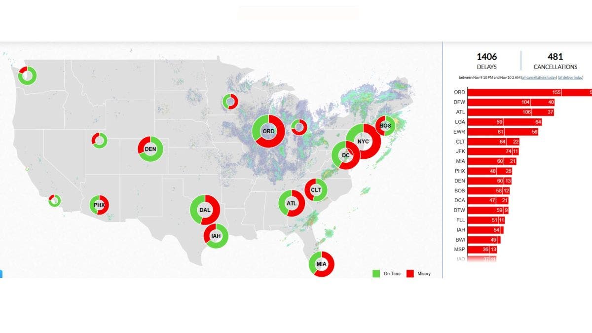 O Misery Map do Flight Aware mostra o número de atrasos e cancelamentos em determinados horários do dia, com base em um período de quatro horas, duas horas antes e depois do horário específico.