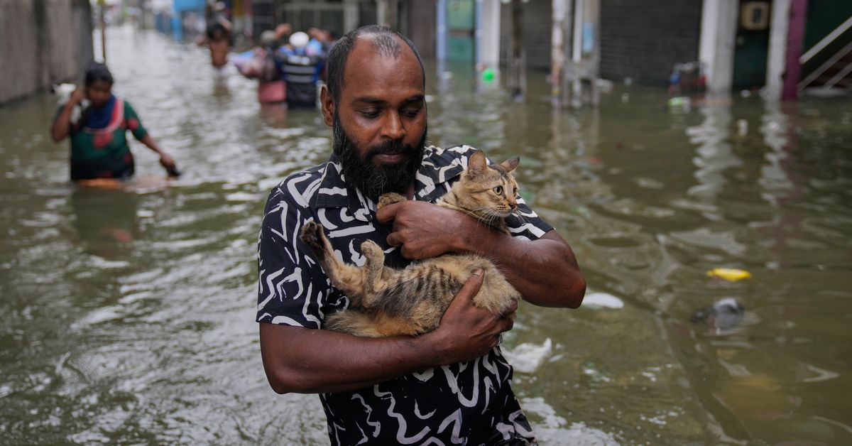 Um homem atravessa uma estrada inundada carregando um gato em Colombo, Sri Lanka, sábado, 29 de novembro de 2025. (AP)