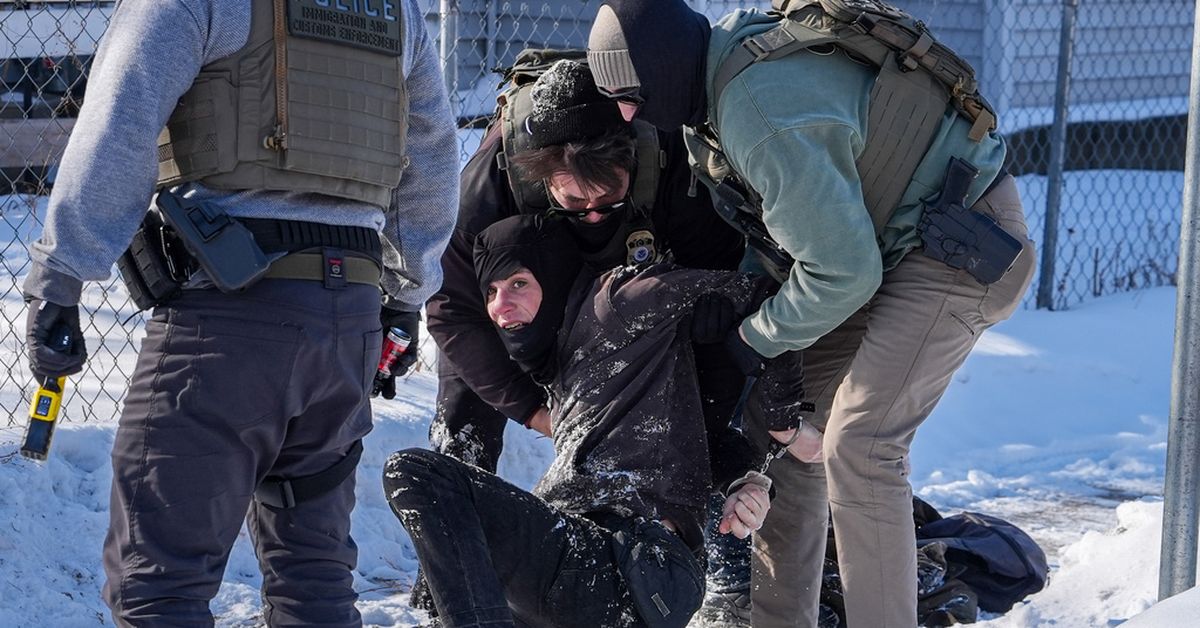 MineápolisUma pessoa é detida por agentes federais na terça-feira, 3 de fevereiro de 2026, em Minneapolis. (Foto AP/Ryan Murphy)