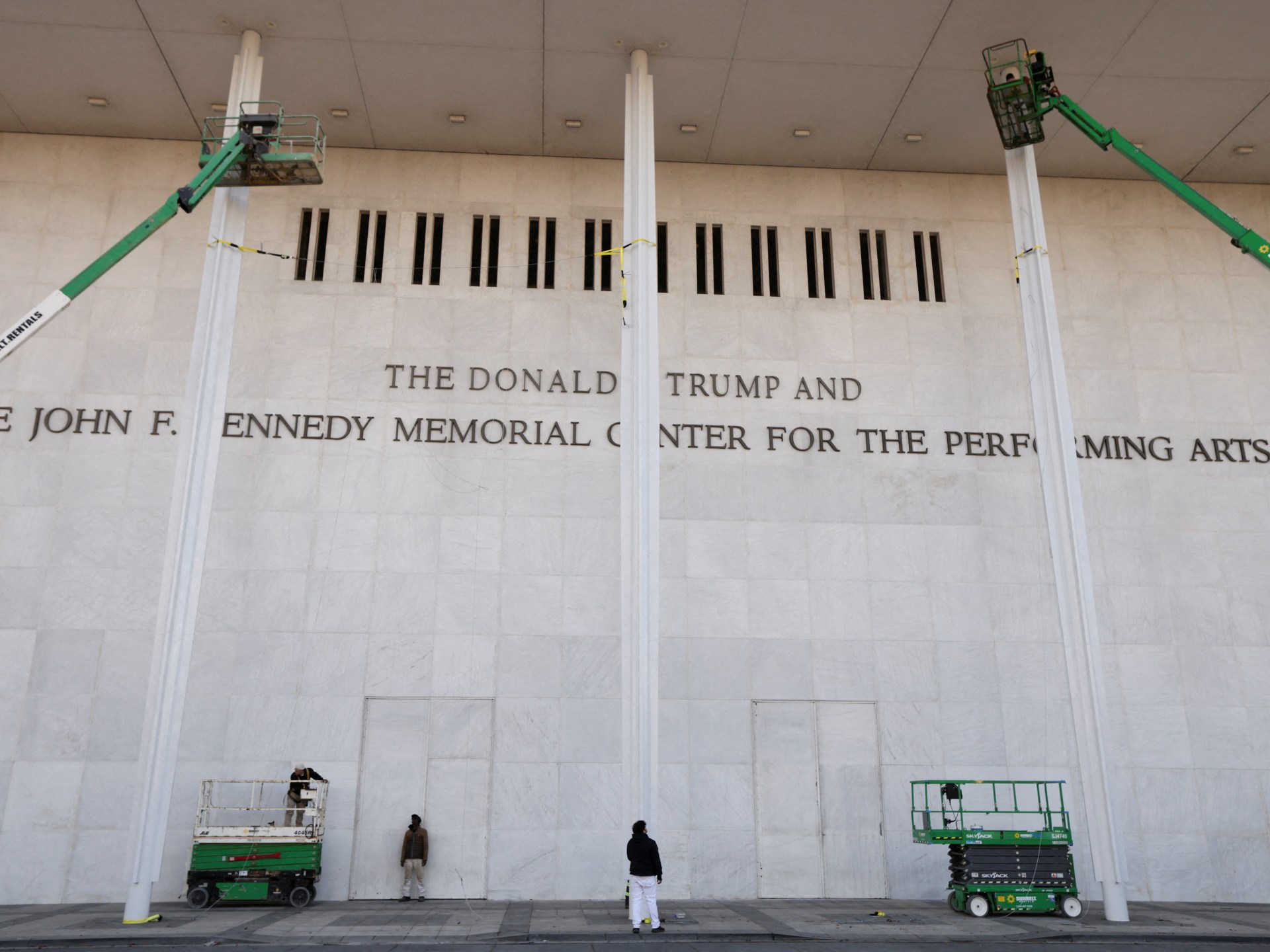 Trabalhadores adicionaram letras de metal ao exterior do edifício na sexta-feira que declaravam: “O Donald J Trump e o Centro Memorial John F Kennedy para as Artes Cênicas”.