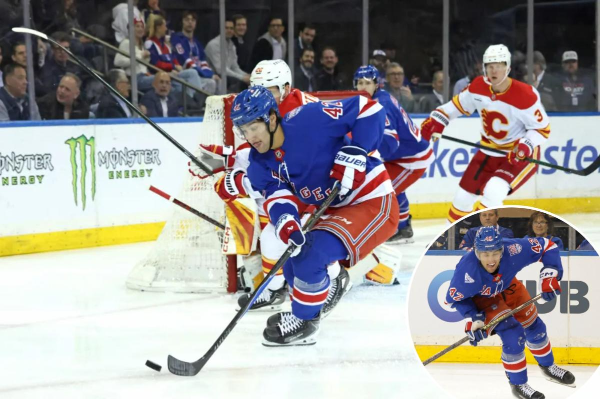 Noah Laba move o disco no gelo durante o primeiro período da vitória dos Rangers sobre os Flames em 10 de março de 2026. Charles Wenzelberg/New York Post