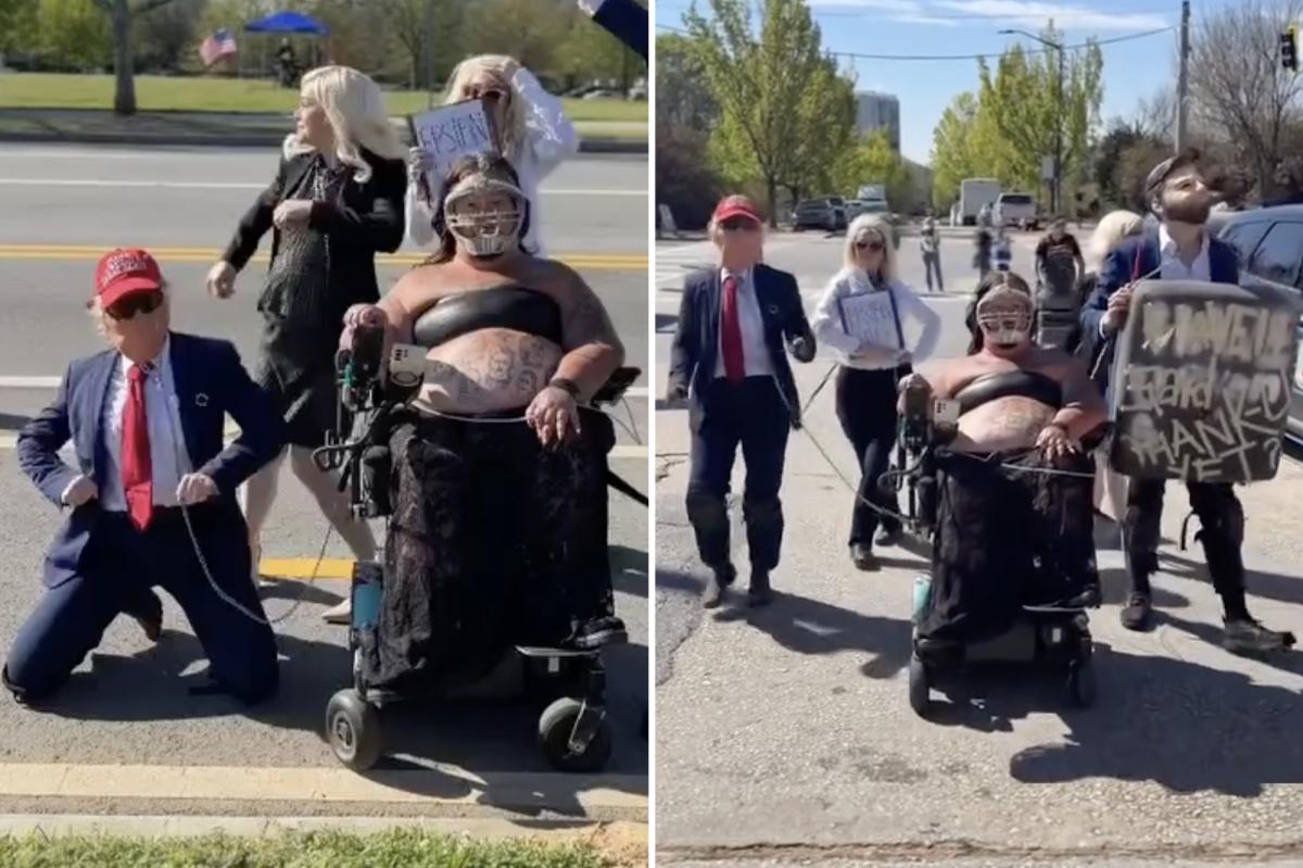 Uma pessoa em cadeira de rodas, usando focinheira e roupa preta, segura uma coleira presa a uma pessoa vestida de Trump, ajoelhada.O grupo estava vestido como funcionários do governo Trump, incluindo o presidente e a vice-presidente, AG Pam Bondi, e a secretária de imprensa da Casa Branca, Karoline Leavitt. wheelie_an_artist/Instagram