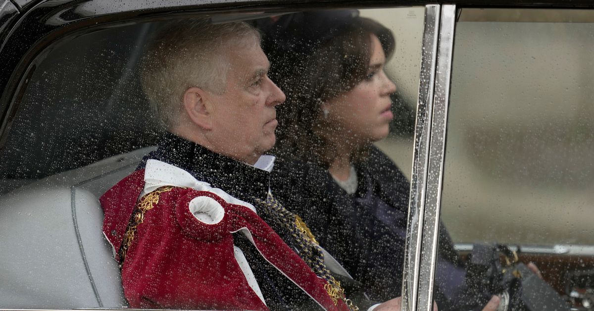 O príncipe Andrew e a princesa Eugenie da Grã-Bretanha chegam antes da coroação do rei Carlos III em 6 de maio de 2023. (AP)
