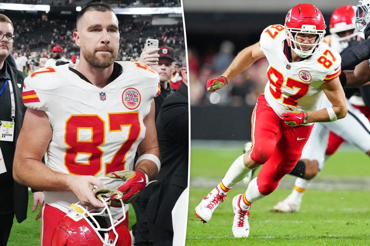 O tight end falou brevemente aos repórteres depois que o Kansas City Chiefs perdeu o último jogo da temporada para o Las Vegas Raiders no domingo. Imagens de Stephen R. Sylvanie-Imagn