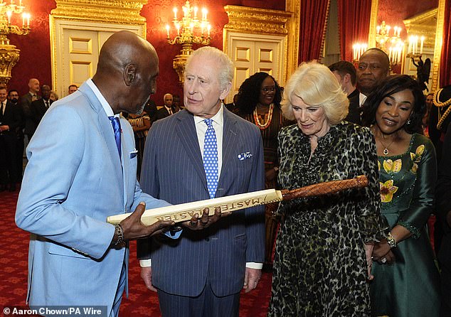 O rei Charles e a rainha Camilla recebem um taco de críquete do grande Sir Viv Richards, das Índias Ocidentais, durante a recepção anual do Dia da Commonwealth no Palácio de St James, em Londres