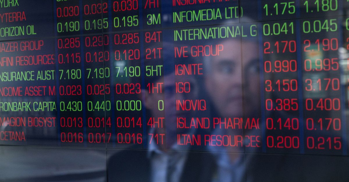 Uma tela na Bolsa de Valores da Austrália mostrando muitas ações no vermelho.
