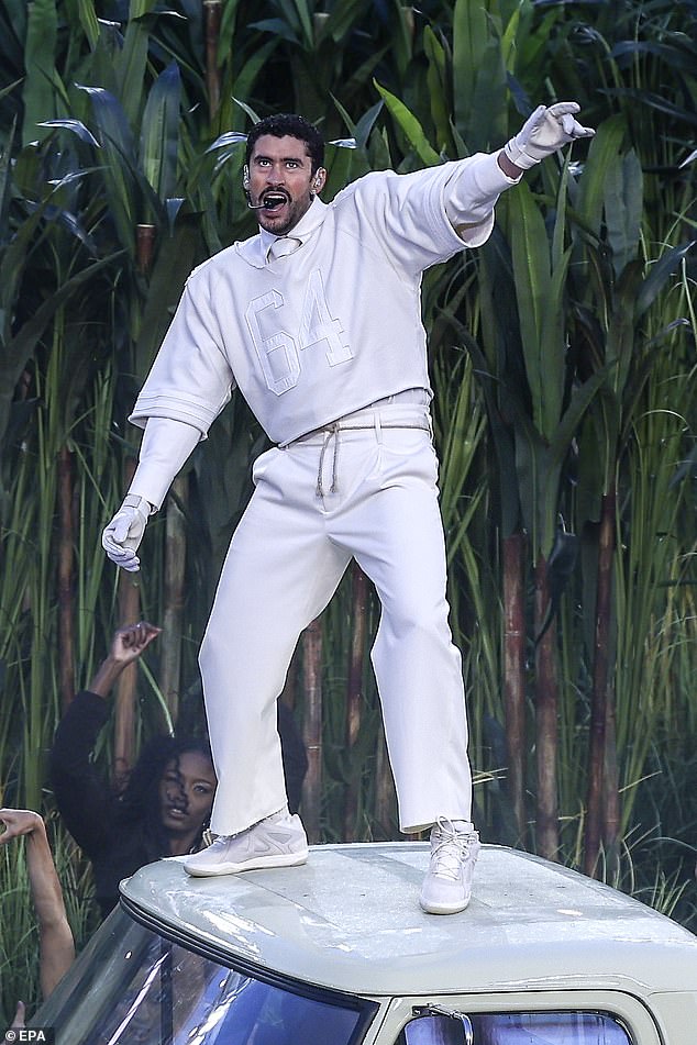 A estrela do reggaeton de 31 anos foi a atração principal do show do intervalo, tornando-se o primeiro artista latino e de língua espanhola a se apresentar solo no cobiçado espaço.