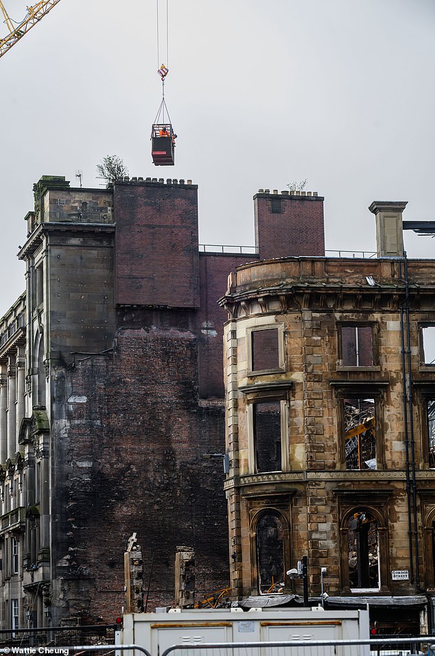 A árdua tarefa de demolir os restos de um edifício histórico de Glasgow destruído por um inferno já começou – com trabalhadores a demolir tijolo por tijolo.