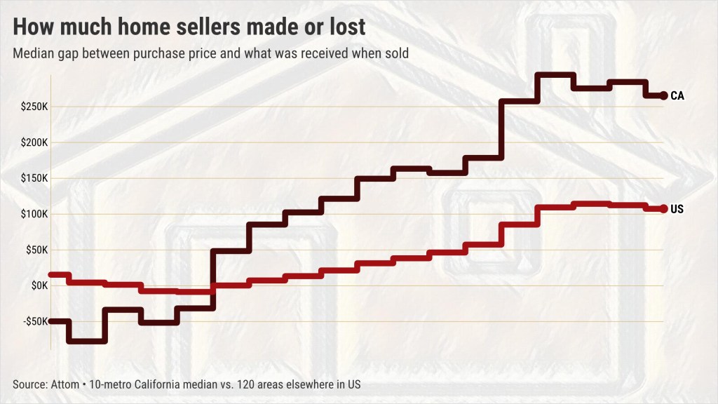 Um vendedor da Califórnia em 2025 obteve um ganho bruto de 63% contra 50% em outros lugares. Mas desde 2008, a venda típica do Golden State criou um ganho de 50%, muito acima do lucro de 20% a nível nacional.