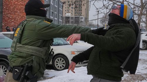 Confronto entre um agente federal e um manifestante em Minneapolis. (AP)