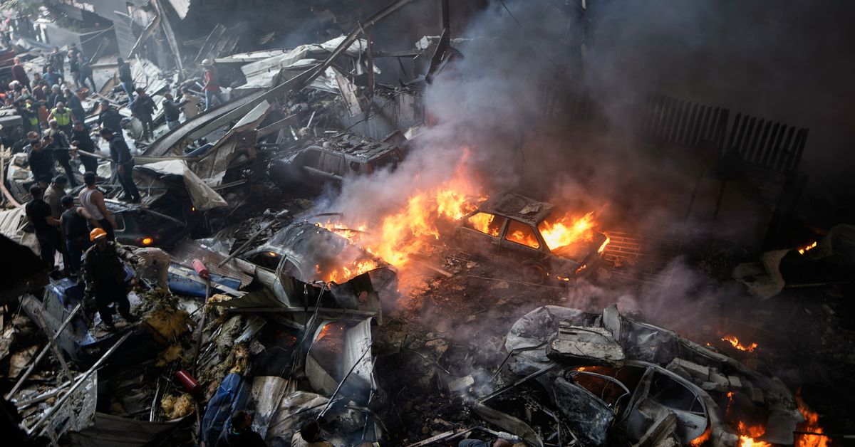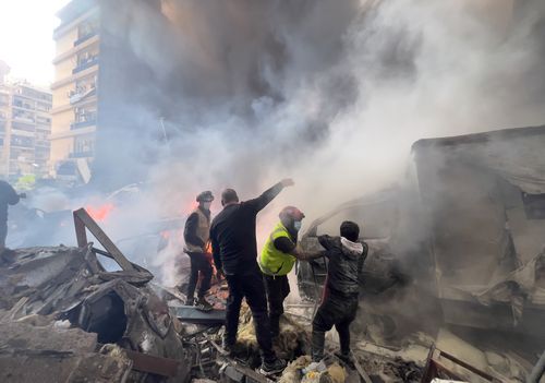 Equipes de resgate se reúnem no local de um ataque aéreo israelense em Beirute, Líbano, quarta-feira, 8 de abril de 2026. (AP Photo/Hussein Malla)