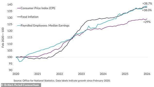 Este gráfico do British Retail Consortium mostra como a inflação do IPC desde 2020 está em 29 por cento – abaixo da inflação geral dos alimentos e dos rendimentos médios dos funcionários, que são ambos de cerca de 38 por cento.