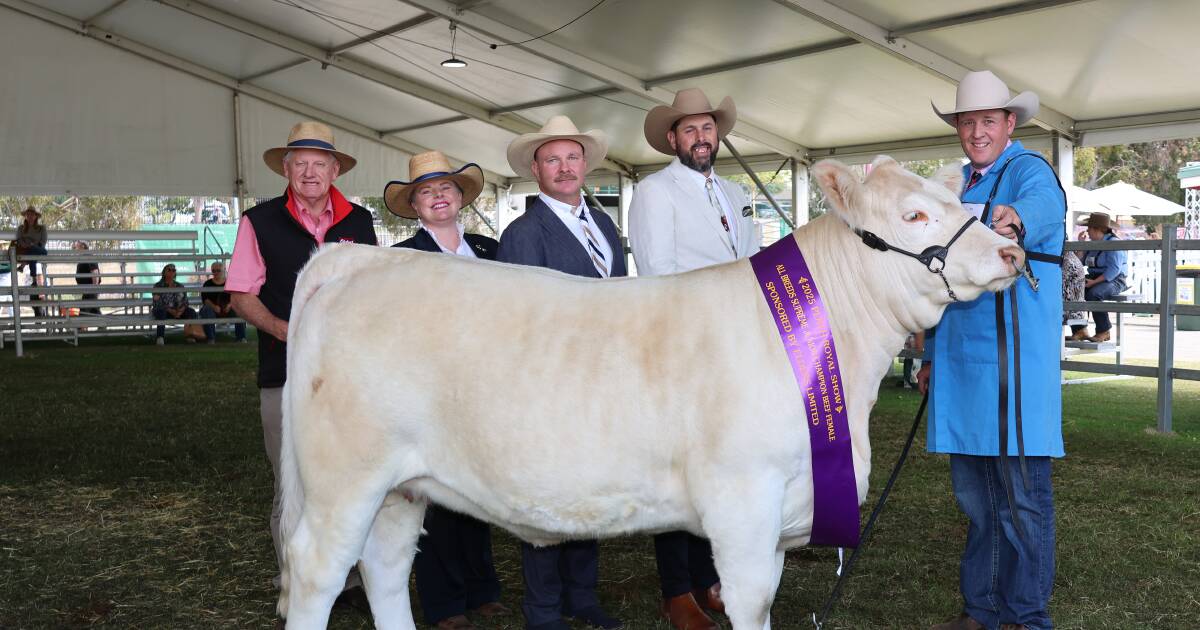 A fêmea campeã júnior de 2025 Perth Royal Show foi exibida pelo gado Venturon Charolais Stud, Boyup Brook. With the Charolais heifer, Venturon Victorias Secret V29 (by Venturon Raise The Bar R1), were sponsor Deane Allen (left), Elders Bunbury branch manager, judges Anne Starr, Foxforth Hereford stud, Guyra, NSW, Marty Lill, Chadwick Downs Braford and Brangus studs, Coonabarabran, NSW and Lee White, Llandillo Hereford and WFB Red Angus Studs, Bathurst, NSW e Harris Thompson, Venturon Stud. Imagem de Kane Chatfield.