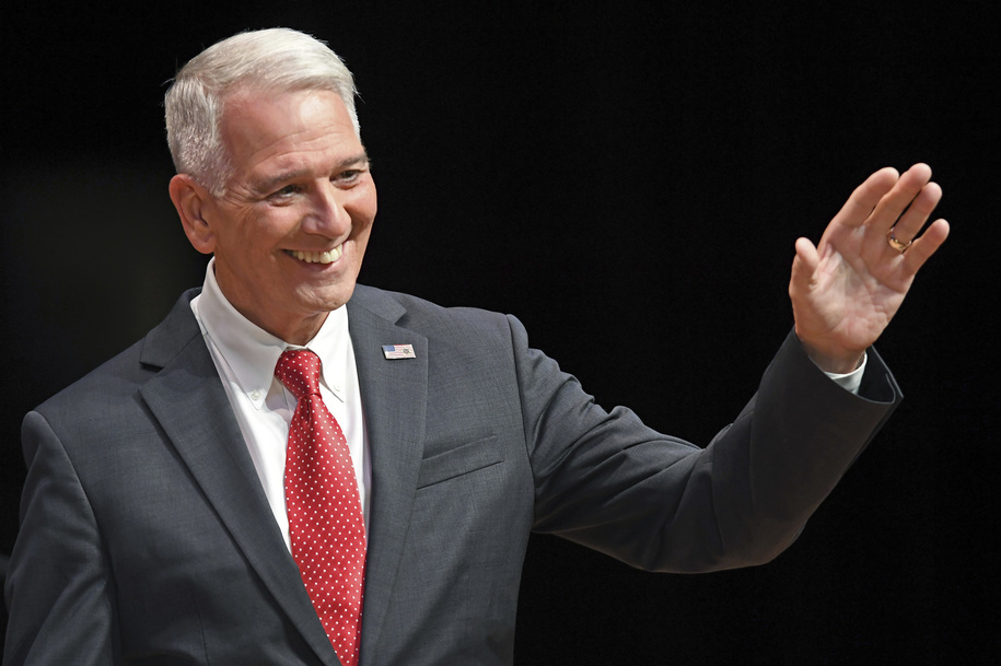 O presidente Donald Trump cumprimenta o candidato republicano ao governador da Louisiana, Ralph Abraham, no comício de campanha de Trump em Lake Charles, Louisiana, sexta-feira, 11 de outubro de 2019. Trump apresentou Abraham e o candidato republicano ao governador Eddie Rispone na véspera da eleição da Louisiana, instando a multidão a votar em qualquer um para destituir o atual governador democrata, John Bel Edwards. (Foto AP/Gerald Herbert)