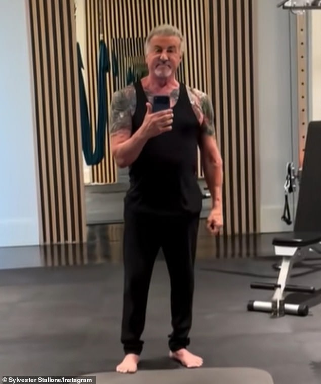Sylvester Stallone exibiu seu bíceps tatuado em raras imagens dele mesmo dentro da academia de sua mansão de US$ 35,3 milhões em Palm Beach, Flórida, no domingo.