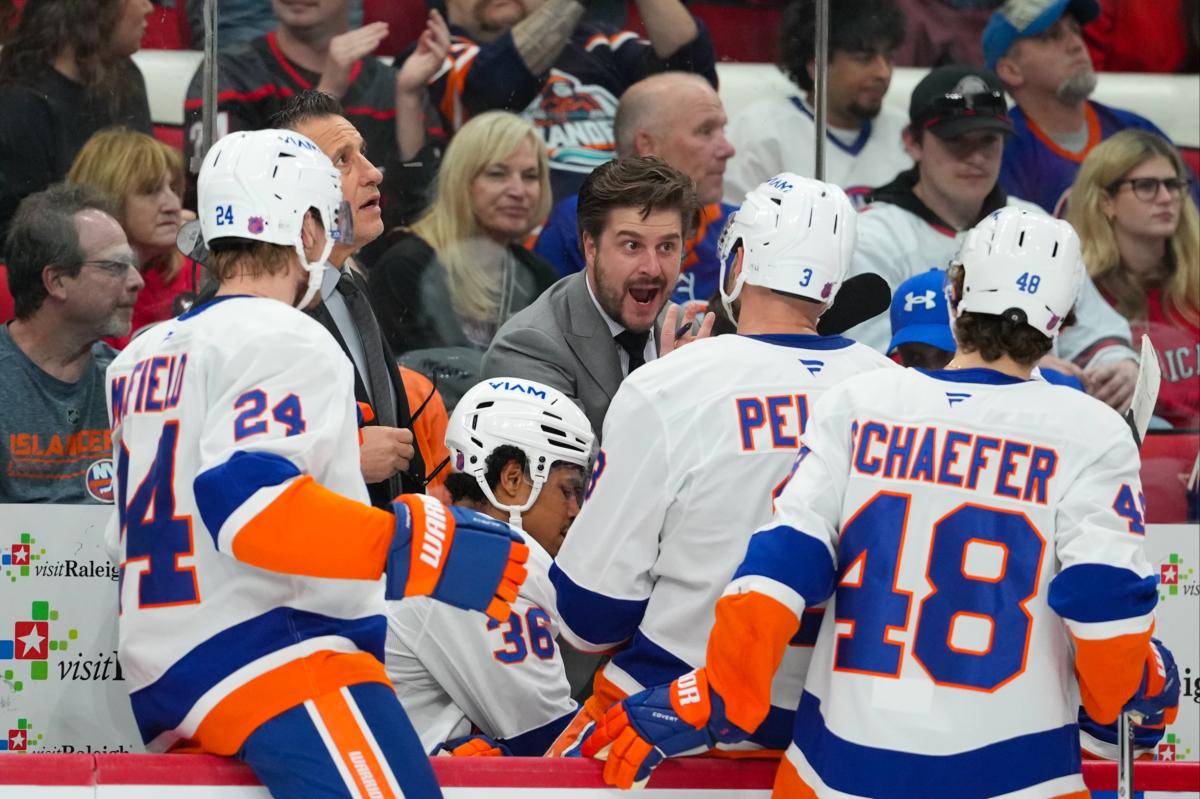 O assistente técnico do New York Islanders, Benoit Desrosiers, conversa com os defensores Scott Mayfield (24), Ryan Pulock (6), Isaiah George (36) e Matthew Schaefer (48) contra o Carolina Hurricanes.