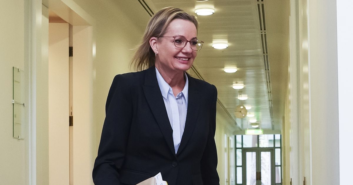 A líder da oposição, Sussan Ley, parte após uma reunião na sala do partido liberal, no Parlamento em Canberra, na quarta-feira, 12 de novembro de 2025. A meta deixará de fazer parte da política climática mais ampla dos Liberais. (Alex Ellinghausen)