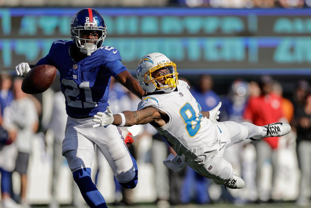 O cornerback Paulson Adebo, que estará enfrentando seu antigo time, The Saints, no domingo, interrompe um passe destinado ao Keandre Lambert-Smith durante a vitória da Semana 4 dos Giants sobre os Chargers. AP