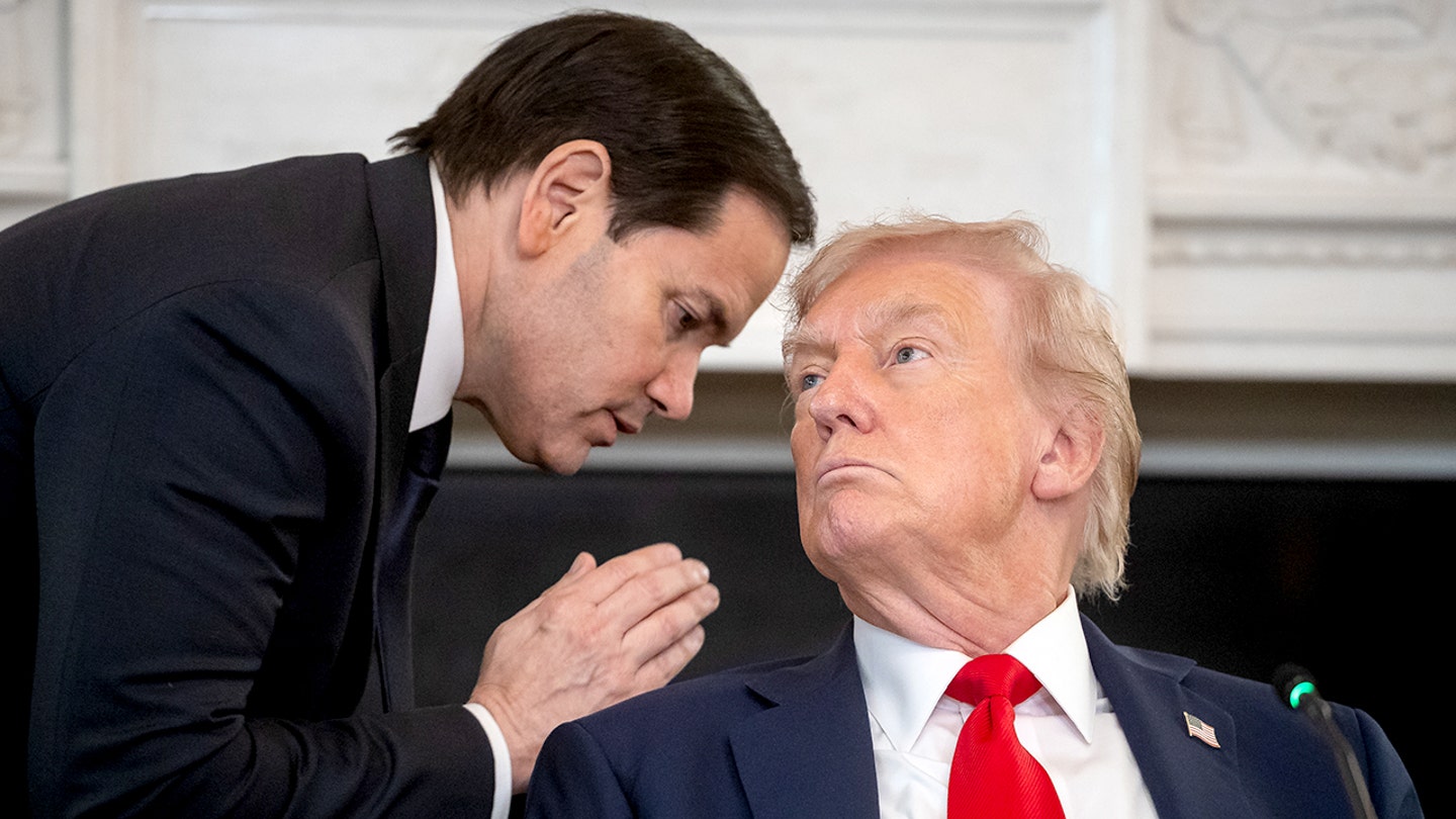 Marco Rubio, Secretário de Estado, à esquerda, e o presidente dos EUA, Donald Trump, durante uma mesa redonda sobre Antifa na Sala de Jantar de Estado da Casa Branca em Washington, DC, EUA, na quarta-feira, 8 de outubro de 2025. (Francis Chung/Politico/Bloomberg via Getty Images)