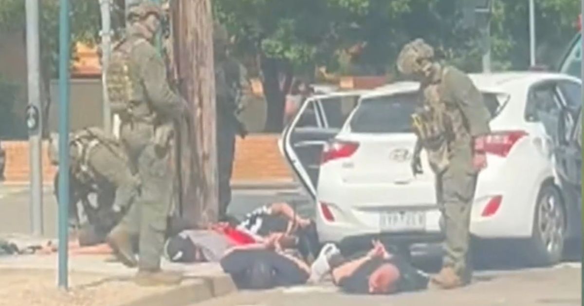 Imagens de vídeo mostram os homens sendo presos, revistados e algemados na esquina das ruas George e Campbell, nos arredores de Liverpool Westfield, depois que seu carro foi interceptado pela polícia.